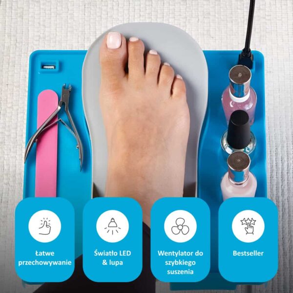 Uzyskaj pedicure jak w salonie w domu z NailEase! Ten regulowany podnóżek oferuje stabilną i wygodną platformę do malowania paznokci bez schylania się lub rozciągania. Z wbudowanym światłem LED, wentylatorem i przegródkami, jest idealny do prostego i bezproblemowego dbania o paznokcie.