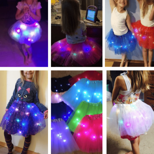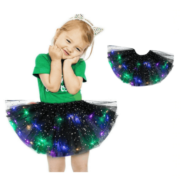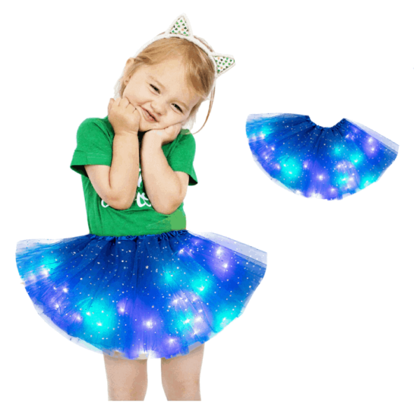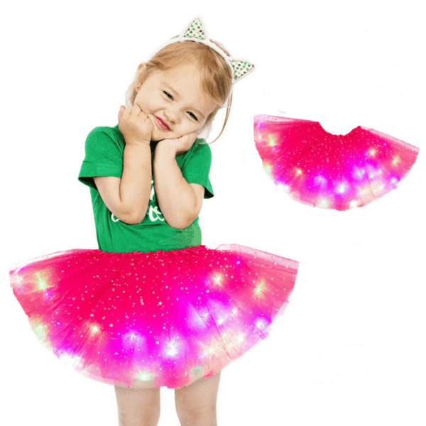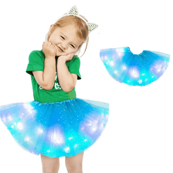 Drobne diody LED są zainstalowane wokół spódnicy i zapewniają wspaniały efekt świetlny podczas ruchu. Spódniczka obraca się razem z dzieckiem i tworzy magiczny efekt świetlny.