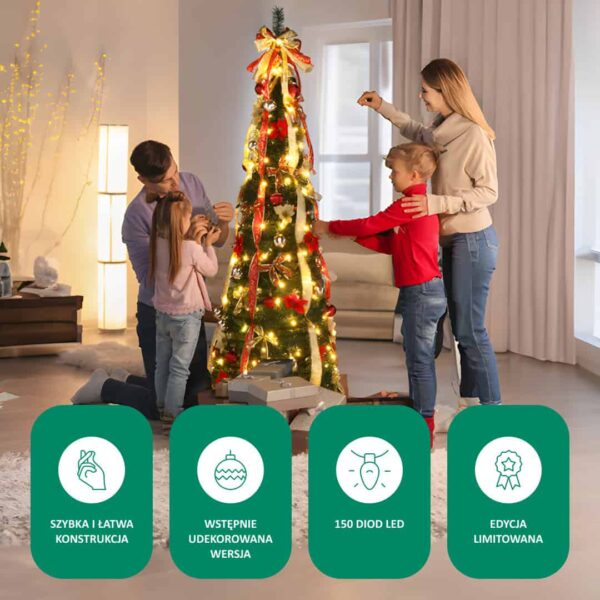 - Ozdoby: Kokardy 11, Wstążki 4, Gwiazdy Bożonarodzeniowe 7, Ozdoby 10, Światła LED 150