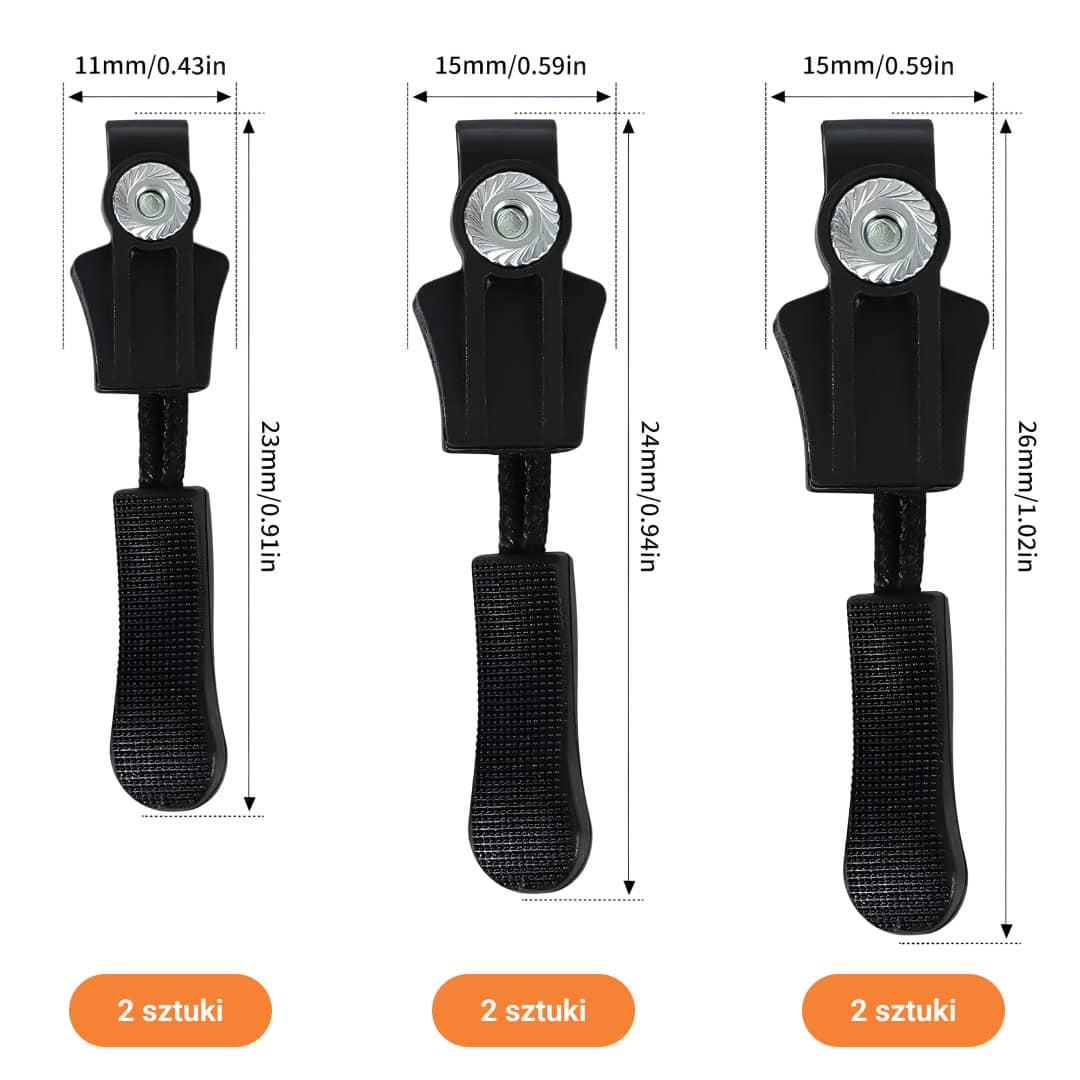 - Zestaw zawiera: 2 x S, 2 x M, 2 x L uchwyty do zamków błyskawicznych
